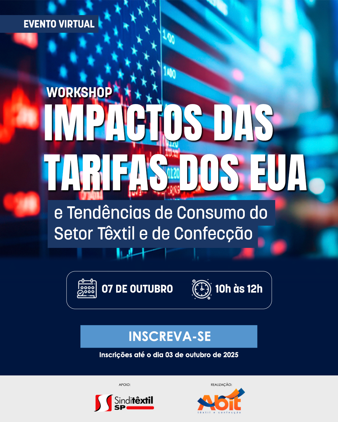 No dia 7 de outubro de 2025, às 10h, a Abit promove um workshop exclusivo para discutir os impactos do aumento das tarifas norte-americanas (“tarifaço”) sobre a economia dos Estados Unidos e sobre as exportações brasileiras de têxteis e confecções.