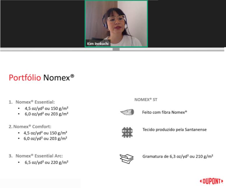 Kim Inokuchi, do Marketing Estratégico da DuPont, explica composição de cada tecido, durante webinar da companhia paara anunciar as mudanças