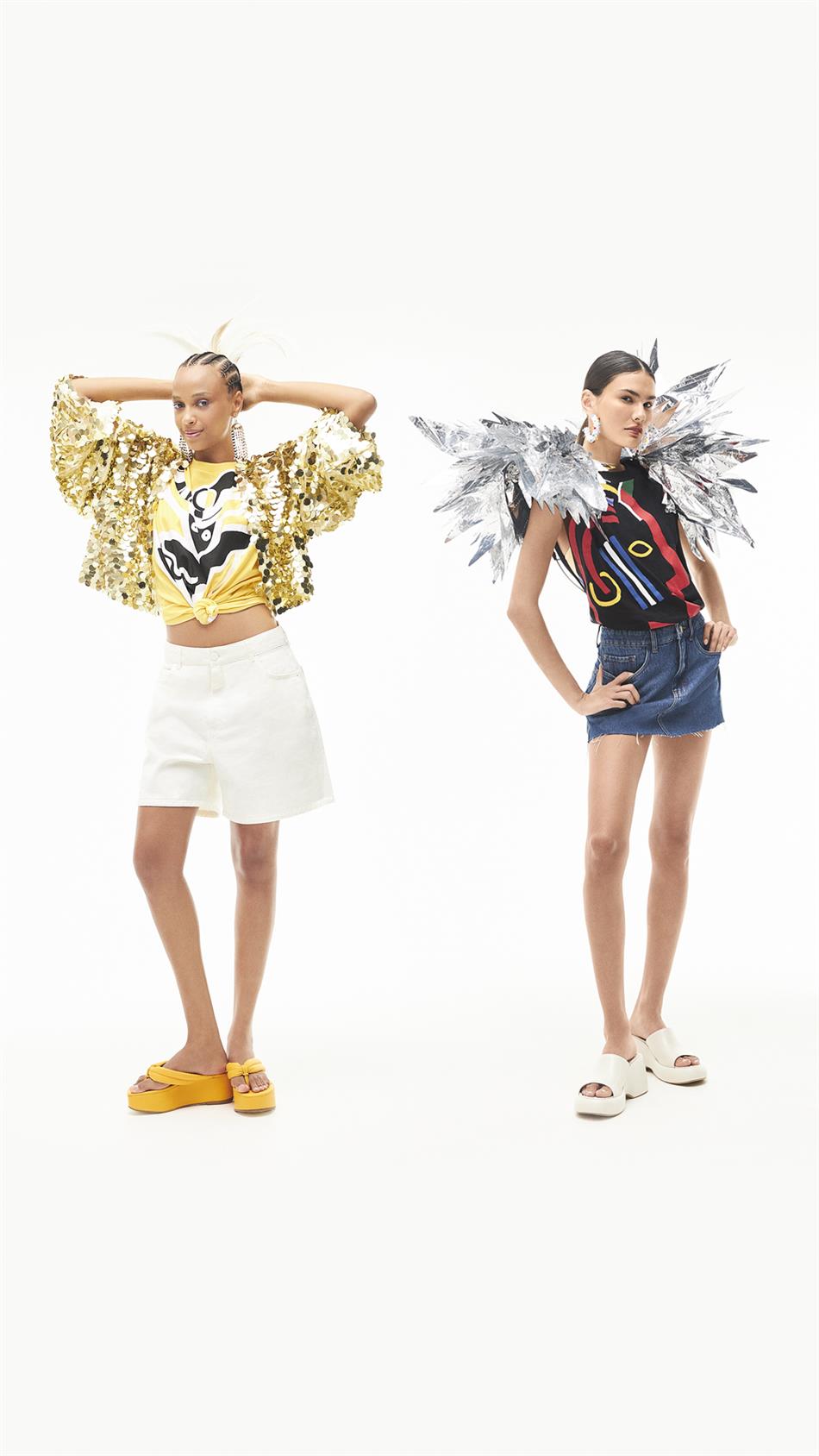 Na modelagem, além do ícone Hering, regatas com ombreiras e pregas. Mas a Hering não parou por aí e trouxe em seu mix três modelos de camiseta com manga de paetê e dois com manga de tule.