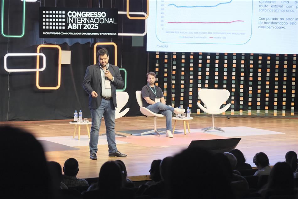 Abrindo o painel, Arthur Dias destacou a urgência de modernizar o parque industrial brasileiro e reverter a estagnação da produtividade no setor têxtil, comparando o desempenho do país com o de países como China, Reino Unido e Estados Unidos. “Nós temos uma guerra de preços global e uma pressão pelos produtos e pelos preços dos insumos que temos”, apontou, avaliando o baixo investimento em bens de capital e a idade média elevada dos equipamentos como pontos de atenção. Como exemplo prático de políticas de fomento à eficiência, Arthur apresentou o programa Brasil Mais Produtivo, que abrange: plataforma de produtividade, diagnóstico e estratégia de gestão, otimização de processos industriais e transformação digital.