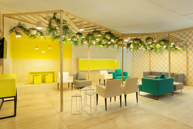 Os móveis quadrados em tons que vão do verde e azul até o amarelo foram dispostos de maneira geométrica no espaço. Para finalizar, uma estrutura em madeira pinus cria o jardim suspenso das espécies Columeia e Rhipsalis em vasos de argila brancos, que dividem espaço com luminárias que pendem do suporte.